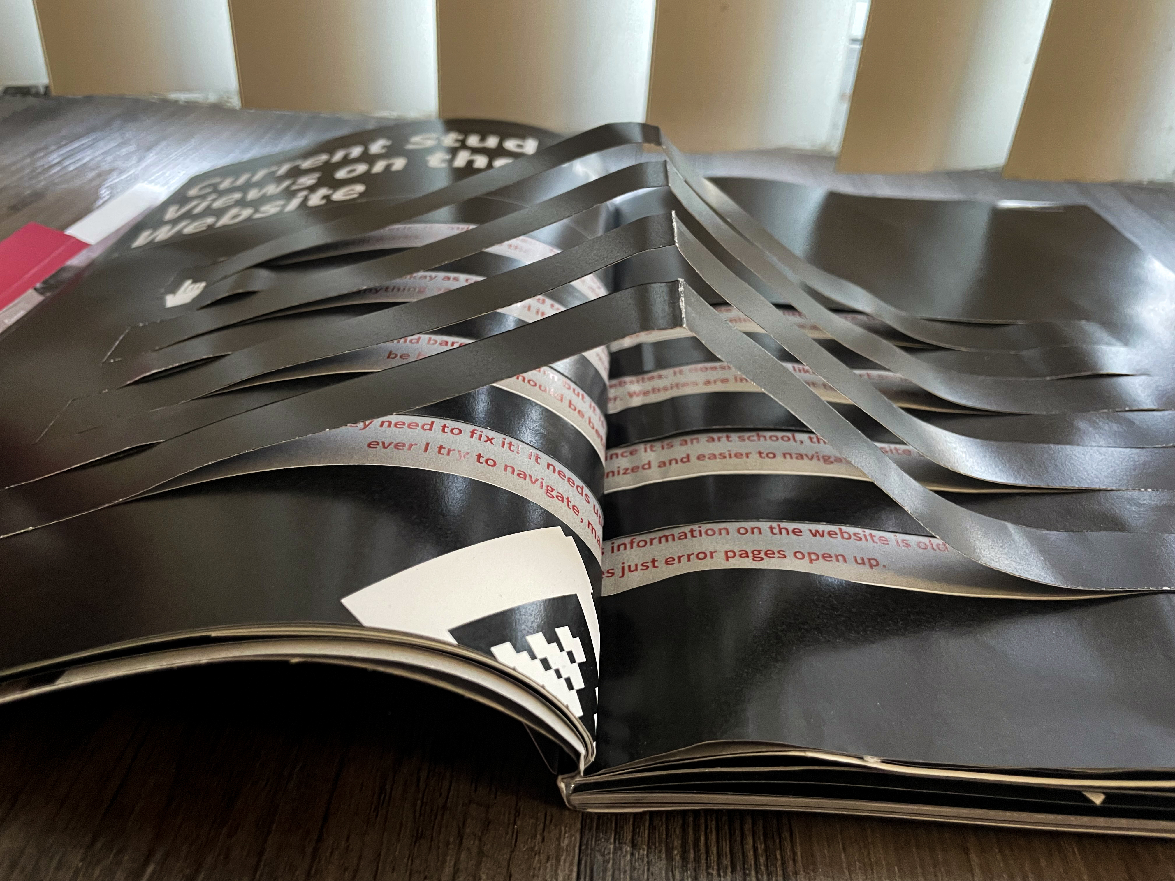 This project is based on research of institutional websites, which was divided into 4 different signatures, experimenting with various book sizes and type layouts. All these signatures were compiled into a final book which I call “Institutional Layers.” This is an interactive book that contains a hint of a website. For example, scrolling became fold-out pages, pop-up screens became a little booklet inside the book, and the website back-end coding became strip pop-ups.